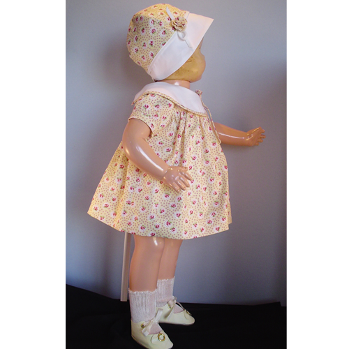 I have been sewing pretty little Effanbee Patsy Doll Dresses lately. This lot of dresses are for the 14″ Patsy doll. But I do make dresses in sizes 11″ – 30″ for the entire Patsy Family dolls. This Effanbee Patsy doll dress and hat are adapted from a 1933 pattern for Patsy Lou. The Patsy Lou pattern was a give away by the McCall Company as a promotion. This Effanbee Patsy dress and bonnet are available in several sizes for your Patsy family dolls. Colors available are in an old print: Lavender, Blue, and Yellow, or in vintage fabric and vintage flour sacks. The dress and hat are 100% cotton. The dress closes in the back with two mother-of pearl-buttons. The cloche hat is trimmed with a self-fabric ruffled rose. The dress comes well above her knees so the lace on her onsie or slip peeks out.