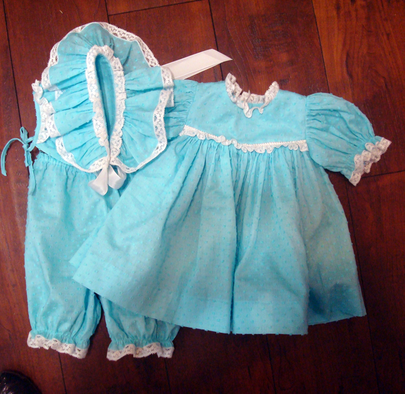 This beautiful baby doll dress aqua-dotted features semi-sheer cotton fabric with Swiss dots or “clip” dots. The bonnet and bloomers are a classic for composition baby dolls with a cloth body. It will also fit all composition or paper mache baby doll bodies. It is made of soft 100% cotton dotted Swiss, trimmed with white cotton lace. The outfit includes the dress with matching bloomers and a bonnet. The slip and booties are available separately.