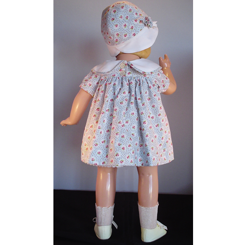 This Effanbee Blue Patsy Play Dress&Hat are adapted from a 1933 pattern for Patsy Lou. The pattern was a give away by the McCall Co. as a promotion. The Effanbee dress and cloche hat are available in several sizes for your Effanbee Patsy family dolls. They are likely to fit other similar dolls of the era also. The 100% cotton fabrics used for these dresses are reproduced from a 30’s classic print. The dress closes in the back with two buttons, and the cloche hat is trimmed with a self-fabric ruffled rose. The smallest sizes may have square snaps rather than buttons in the back. The dress bodice and cloche hat are lined too.