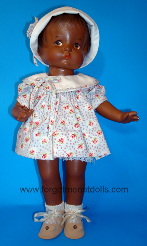The Patsy Joan doll came in two different sizes. In the 1930s Patsy Joan’s hair was styled in a short bob just like the other Patsy family dolls and she was 16 inches tall. In 1946 Patsy Joan was issued as a 17-inch doll with molded curly hair and she was marked Effandbee on her back. Dresses and hats are available in both sizes.