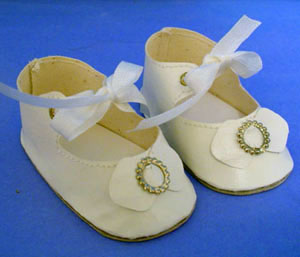 These Center Tie Doll Shoes for your Patsy Dolls & Shirley Dolls are the classic style found on most little girl dolls of the 30s. They have edge stitching, eyelets, and rayon center ties. They are available in a true painted oilcloth, not a modern plastic. Buckle or bow trims and ribbon ties may vary from those shown. These are high-quality shoes for your Patsy or Shirley dolls. Vintage rayon doll socks are available for your dolls also. Or you may choose the Ribbed Rayon Doll Socks.