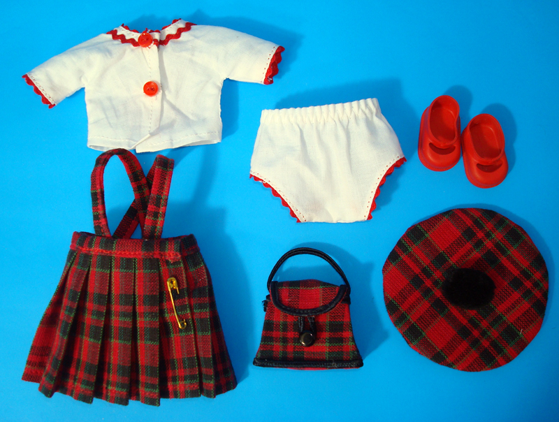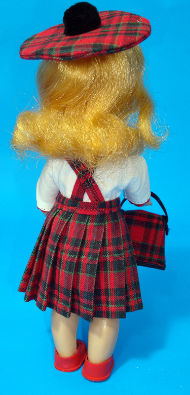 Ginny School Girl Plaid – Set includes pleated plaid skirt, blouse, panties, beret, purse as well as red plastic shoes. The blouse is trimmed with ricrac and buttons. It closes in the front with two square snaps. This classic outfit was made to fit the 7″ – 8″ hard plastic dolls from the 50’s. Fits dolls such as Ginny, Wendy, Muffie, and Daily Dolly.