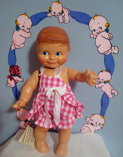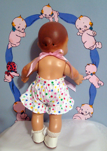 This darling Kewpie Doll Ruffled Sunsuit was copied from a 1935 Kewpie doll sunsuit. It will fit your Kewpie, Scootles, Giggles, or any other chubby 12″ toddler. Made of 100% cotton, it snaps in the back and wraps to tie in the front with vintage rayon ribbon. Lower edges are in a darling ruffle.