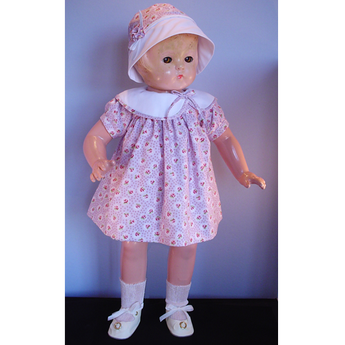 This Effanbee Lavender Patsy Play Dress&Hat is adapted from a 1933 pattern for Patsy Lou. The pattern was a giveaway by McCall Co. as a promotion. The Effanbee dress and cloche hat are available in several sizes for your Effanbee Patsy family dolls. They are likely to fit other similar dolls of the era also. The 100% cotton fabrics used for these dresses are reproduced from a 30s classic print. The dress closes in the back with two buttons, and the cloche hat is trimmed with a self-fabric ruffled rose. The smallest sizes may have square snaps rather than buttons in the back. The dress bodice and the cloche hat are lined too.