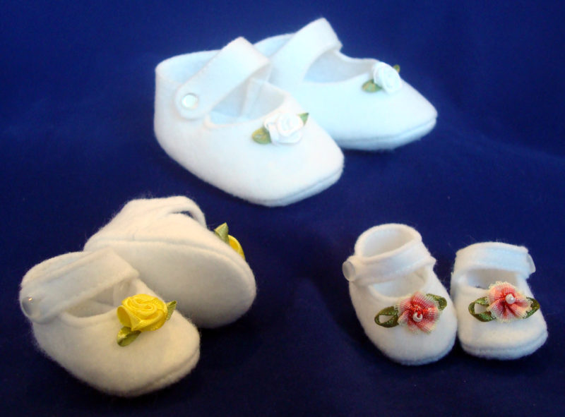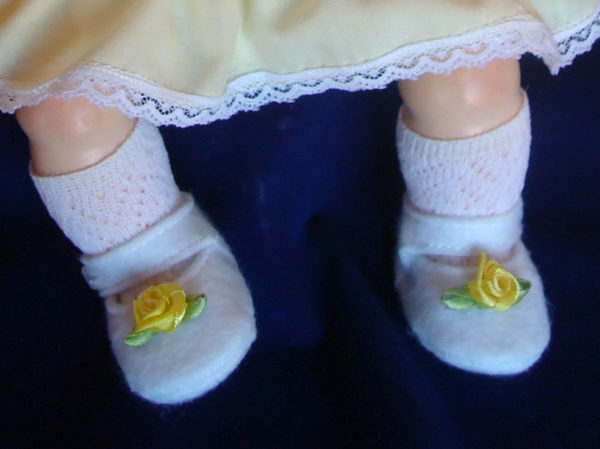 These MaryJane Baby Doll Booties are a soft Mary Jane style made of white felt that button on the side. They are intended for the chubby baby feet on modern vinyl baby dolls from about 1960 to the present. They come with a ribbon rose on the toe of the bootie. If you want a color other than a pink rose, add that request in the notes section when you order. The soles are soft so they conform to the different shapes of chubby baby feet with turned up or spread toes. Measure your doll’s foot, then add 1/4″ to find the sole size.