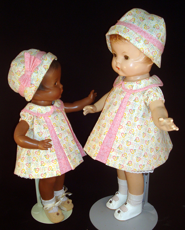 This Effanbee PinkPleat Patsy doll dress and cloche hat made in a 100% cotton reproduction print closes in the back with two mother-of-pearl buttons. A saucy bow trims the cloche hat. This Effanbee PinkPleat Patsy doll dress and cloche hat are available in several sizes for your Patsy family dolls. Collar, pleats, and hats have contrasting fabrics.