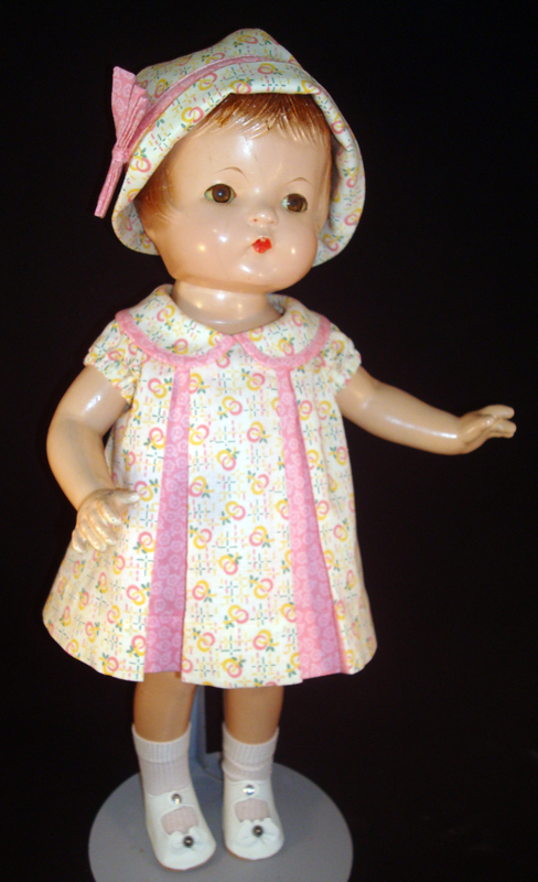The Patsy Joan doll came in two different sizes. In the 1930s the 16″ Patsy Joan’s hair was styled in a short bob like the other Patsy family dolls. In 1946 Patsy Joan was issued as a 17-inch doll with molded curly hair and marked Effandbee on her back. Measurements on both dolls are nearly the same. The 1946 doll is just a little taller. Dresses and hats are available in both sizes.