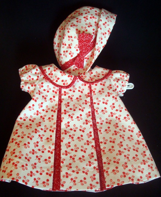 This Effanbee RedPleat Patsy doll dress and cloche hat made in a 100% cotton reproduction print closes in the back with two mother-of-pearl buttons. A saucy bow trims the cloche hat. This Effanbee RedPleat Patsy doll dress and cloche hat are available in several sizes for your Patsy family dolls. Collar, pleats, and hats have contrasting fabrics.