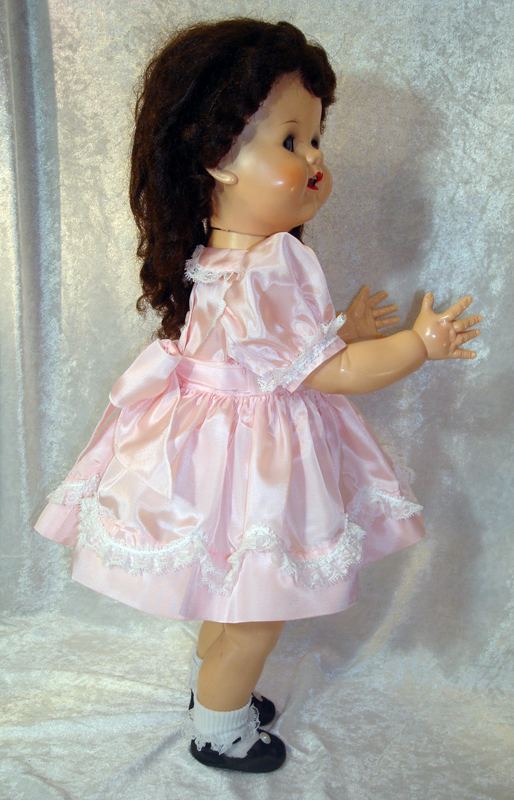 SaucyWalker Doll Dress PartyPink, made of vintage acetate taffeta, has a full skirt with puff sleeves and is trimmed with lace. This Saucy Walker dress closes in the back with three white buttons and ties with a bow in the back. Petticoat and Panties are also available for her.