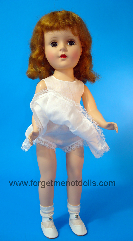 SweetSue Margaret Combination PantiesSlip made of vintage off-white cotton batiste trimmed with lace. This combination closes with two square snaps in the back. These are the combination full slip and panties that are often found on many of the hard plastic dolls from the 1950s. The shoes and socks pictured are available for your dolls also.