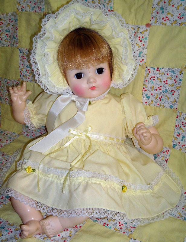Chubby Baby Doll Clothes – This frilly baby doll dress, bloomers, and bonnet are made for the really chubby baby dolls with cloth bodies and vinyl arms and legs from about 1960 to the present. These will fit Madam Alexander’s chubby babies like Thumbelina, Pussy Cat, Puddin’, etc. The ribbon tie around the waist can be adjusted for a smaller waist size. They are made of a cotton blend with lots of vintage nylon lace, ribbon, and embroidered flower trim. Lace and trim may vary from those shown. Dresses close in the back with either buttons or snaps. The bonnets tie in the back, so the fit can be adjusted. The bonnet may differ from the one shown.