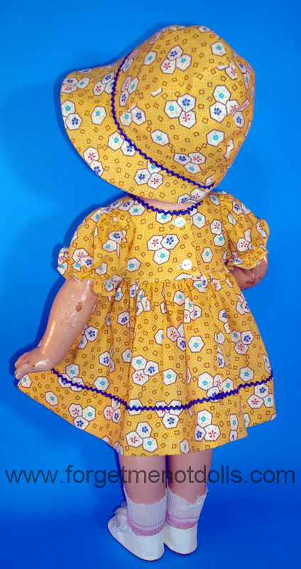 This Effanbee Yellow Patsy Day Dress&Hat are available in several sizes for your Effanbee Patsy family dolls. The 100% cotton dress closes in the back with two buttons and is adorned with contrasting vintage trim. Except the smallest sizes may have square snaps rather than buttons in the back. The dress bodice and cloche hat are lined too.